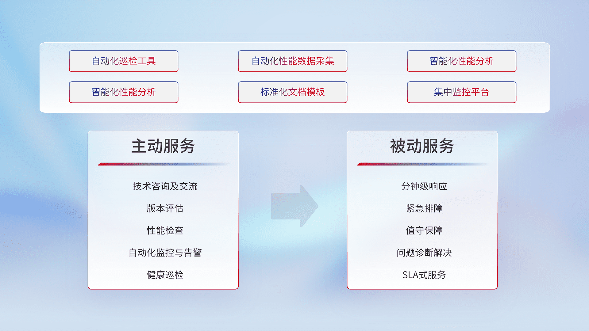 智能化工具和标准化文档,,,保障服务质量,,,,提供主动服务(包含技术咨询、、、版本评估、、、性能检查、、、自动化监控与告警、、、、健康巡检)和被动服务包含(分钟级响应、、、紧急排障、、、值守保障、、、、问题诊断解决、、、SLA服务)。。