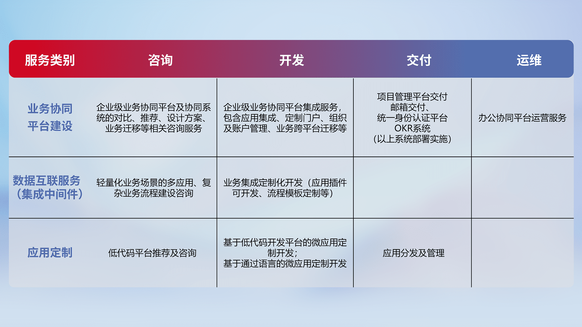 针对钉钉、、企微、、IDaas等平台级产品提供产品的规划、、方案、、、交付、、、定制化开发等服务,,实现如统一协同办公、、智能客户服务、、混合会议管理、、智能数据查询、、、、等业务场景,,,实现数字化转型。。